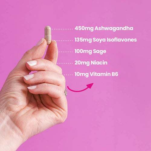 Each capsule contains 450mg Ashwagandha, 100mg Sage, 135mg Soya Isoflavones standardised to provide 54mg of Genistein, 20mg Niacin (B3) and 10mg Vitamin B6.